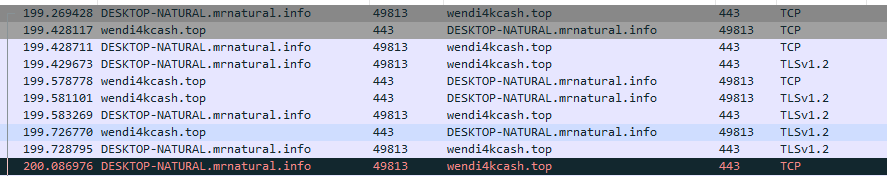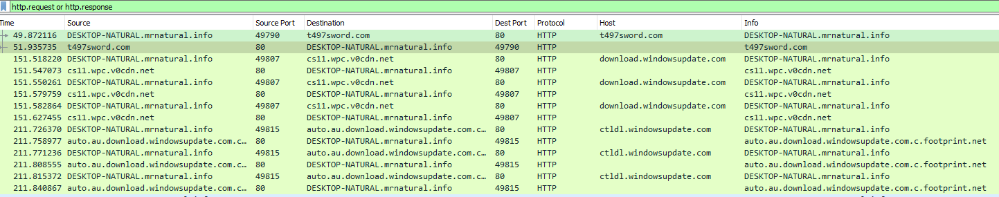 I want to see if I can find any kind of suspicious requests that interacted with our host so far t497sword.com sticks out like a sore thumb and the target was host DESKTOP-NATURAL. so we will want to keep that noted. But we want to see what is possibly happening between these two and one way to start is a TCP Stream.