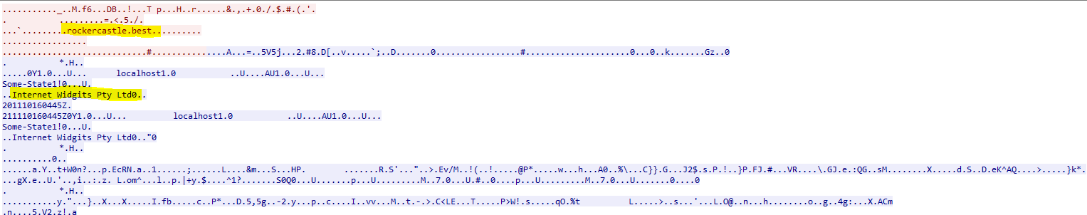After that I wanted to investigate more into “Internet Widget pty ltd” and thankfully this pcap isn’t flooded with thousands of domains. I did discover woodenbruus which also showed “Internet Widgets pty LTD” again you follow the TCP stream. They tend to uncover a lot of information on what is happening besides all the “gibberish” characters.